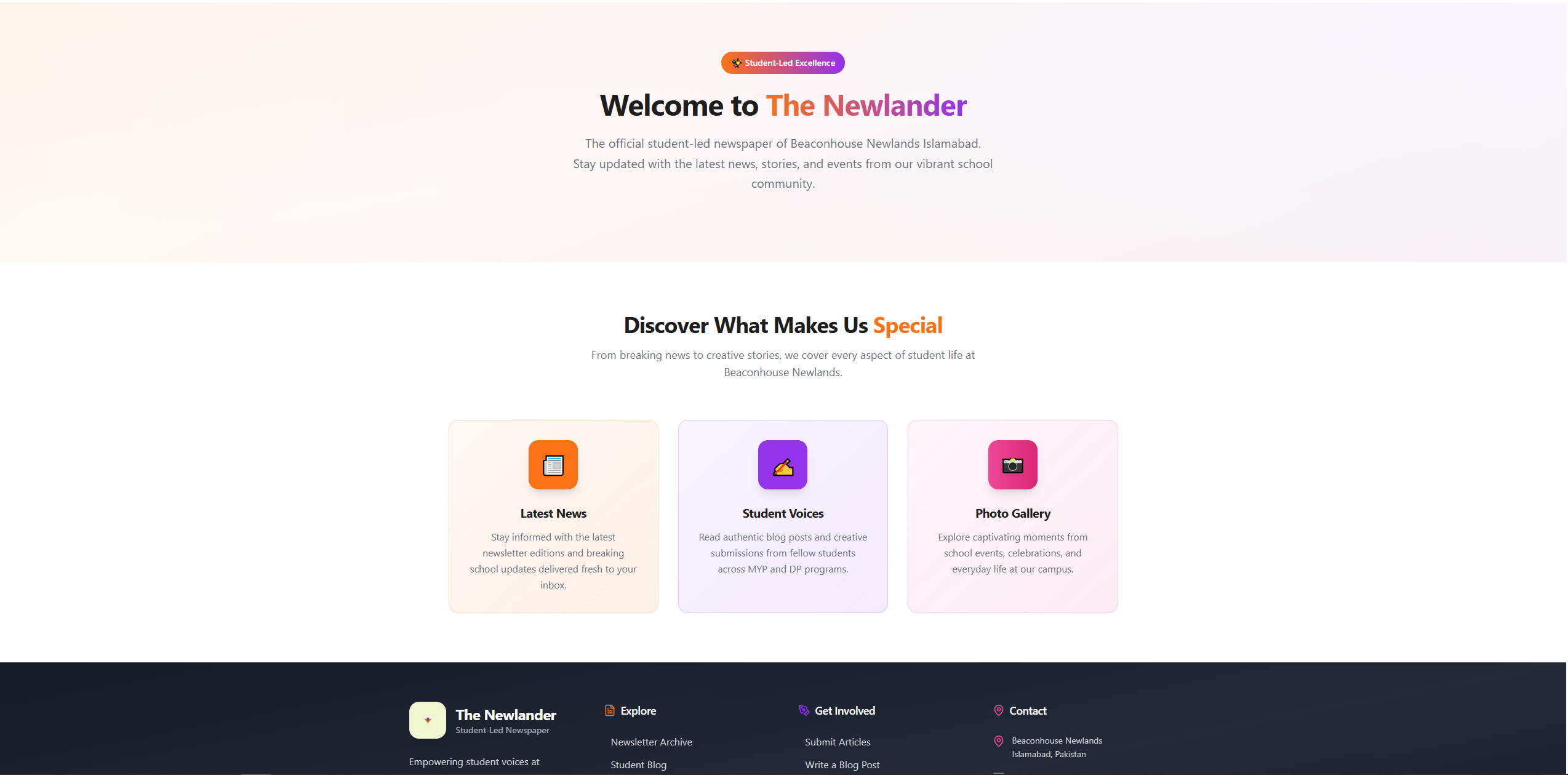 A student-led newsroom for Beaconhouse Newlands Islamabad featuring investigative pieces, culture columns, and multimedia storytelling. Editorial teams collaborate in real time, with automated publishing queues and reader insights built in.